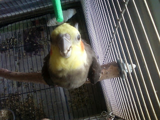 After having for a while we got our cat, she still gives him a wide berth as she was just a kitten when we got her and Sammy would open his wings wide and squawk at her when she came near his cage. The memory I recalled is actually about what happened when we bought our second bird, Cookie. She is a lot more curious than Sammy - having not had the rough life and being exposed to plenty of toys at the pet store we purchased her. She would climb upside down in the cage and Sammy would watch and watch her - giving her a wide berth.
